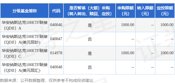 本站消息,7月15日华安基金管理有限公司发布《关于华安纳斯达克100交易型开放式指数证券投资基金联接基金(QDII)暂停大额申购、大额定期定额投资的公告》。公告中提示,为了保证基金的平稳运作,保护基金持有人利益,本基金管理人决定自2025年7月15日起暂停本基金A类、C类人民币基金份额的大额申购及大额定期定额投资业务,自2025年7月15日起华安纳斯达克100交易型开放式指数证券投资基金联接基金(QDII)暂停大额申购、大额定期定额投资,申购上限金额为0.1万元,下属分级基金调整明细如下: